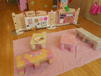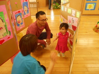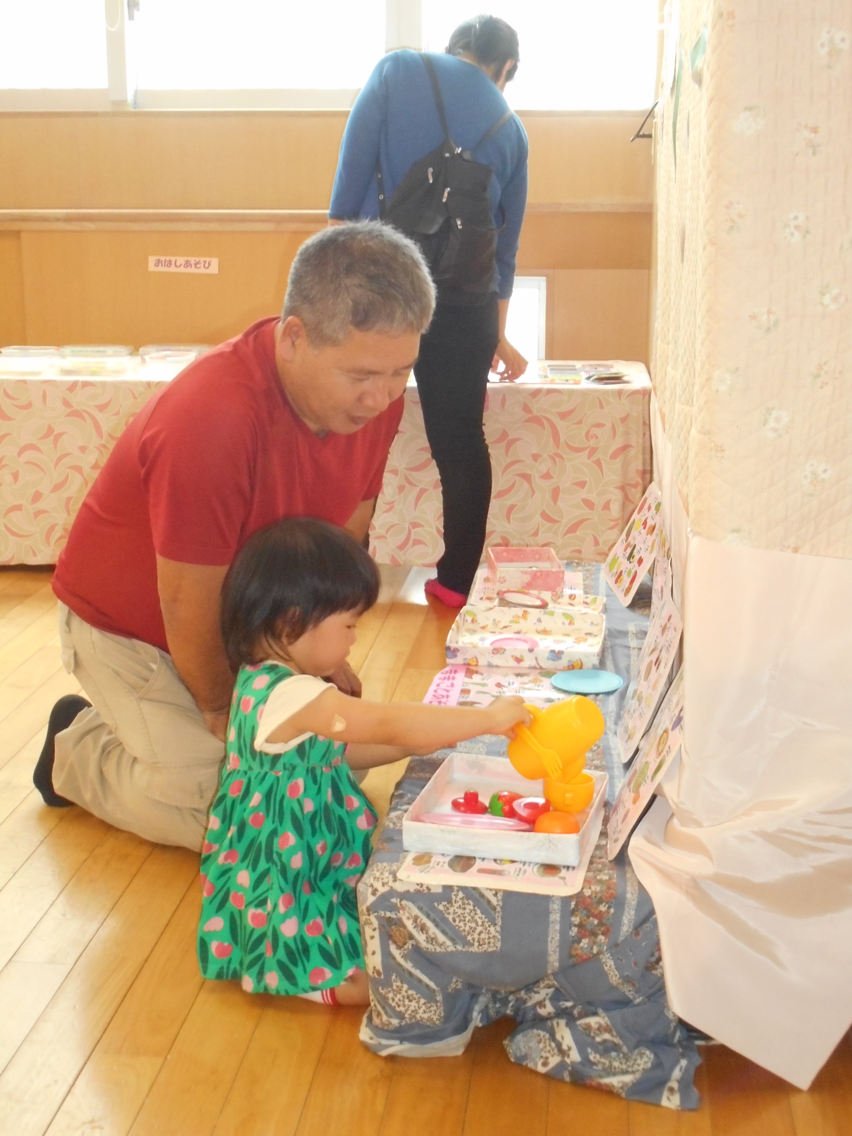 手作りコーナーからは“ハッピーバースデー”と可愛い歌声が聞こえてきて、お誕生会の手作りケーキを抱いて、周りの注目をあびながら楽しそうに歌っている姿があり、みんなが暖かい気持ちに包まれる場面がありました。手作り遊具でたっぷりとあそび満足して帰っていく子どもたちの姿もみられました。