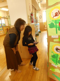 描画コーナーでは「こんなに上手に描けるようになったんだね~」「一年の成長を感じますね~」「一人ひとりの性格がわかるね~」といういろいろな声やおじいちゃん、おばあちゃん達もお孫さん以外のお子さんの作品も興味津々に見ていて「これはどうやって作ったの?」「こどもの作品は凄いね~」「0歳から絵の具を触るんだね~」といった感想も聞かれましたよ。