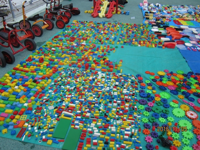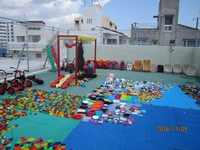 スカイルーフ(屋上)では子ども達の大好きなブロックに"ままごと道具"大量の遊具を前に、お母さん達は、